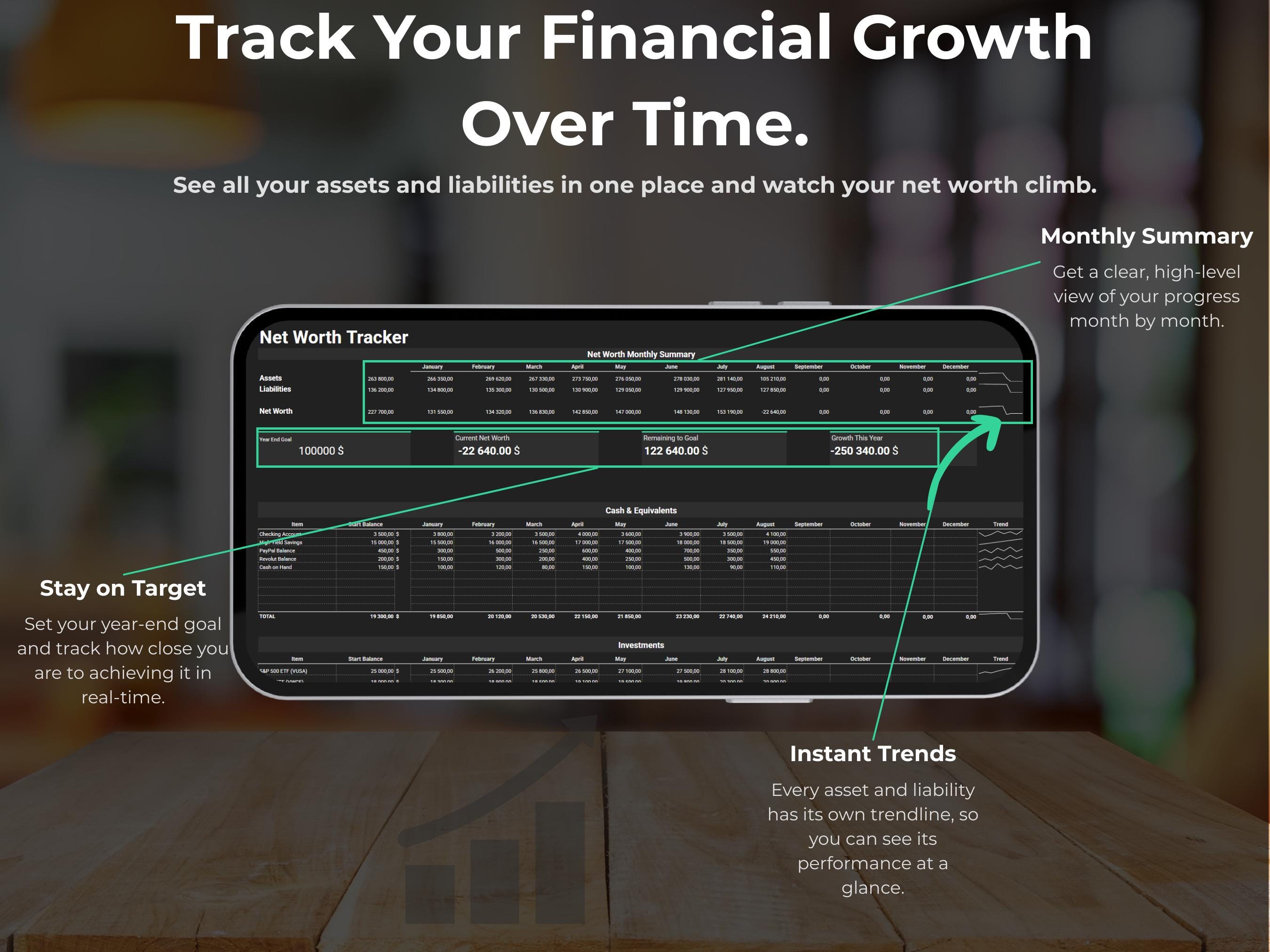 Track Your True Wealth: The Net Worth tracker gives you a clear, month-by-month overview of your financial growth.