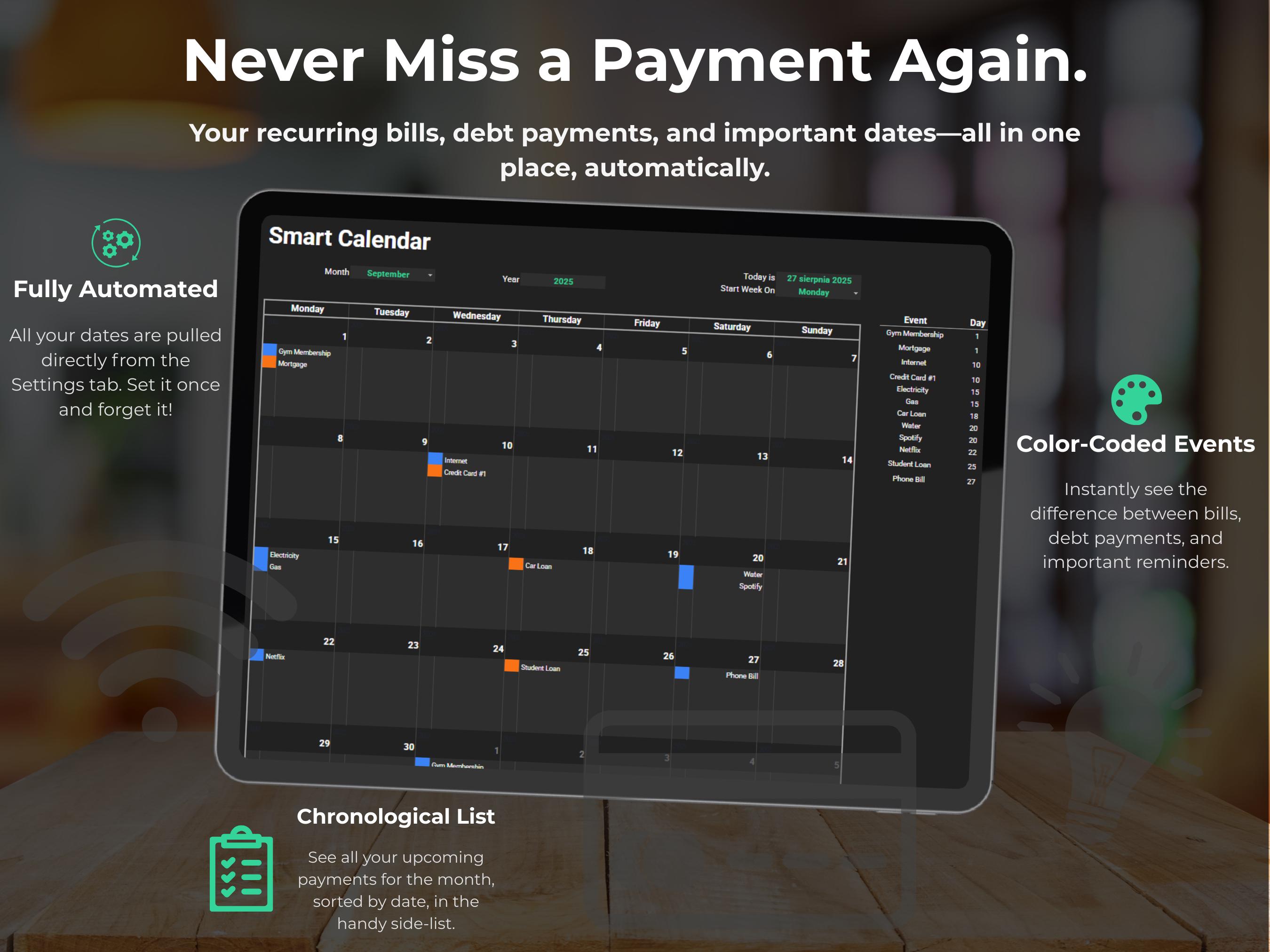 Never Miss a Payment: The Smart Calendar automatically plots your recurring bills and important dates, keeping you organized and on time.