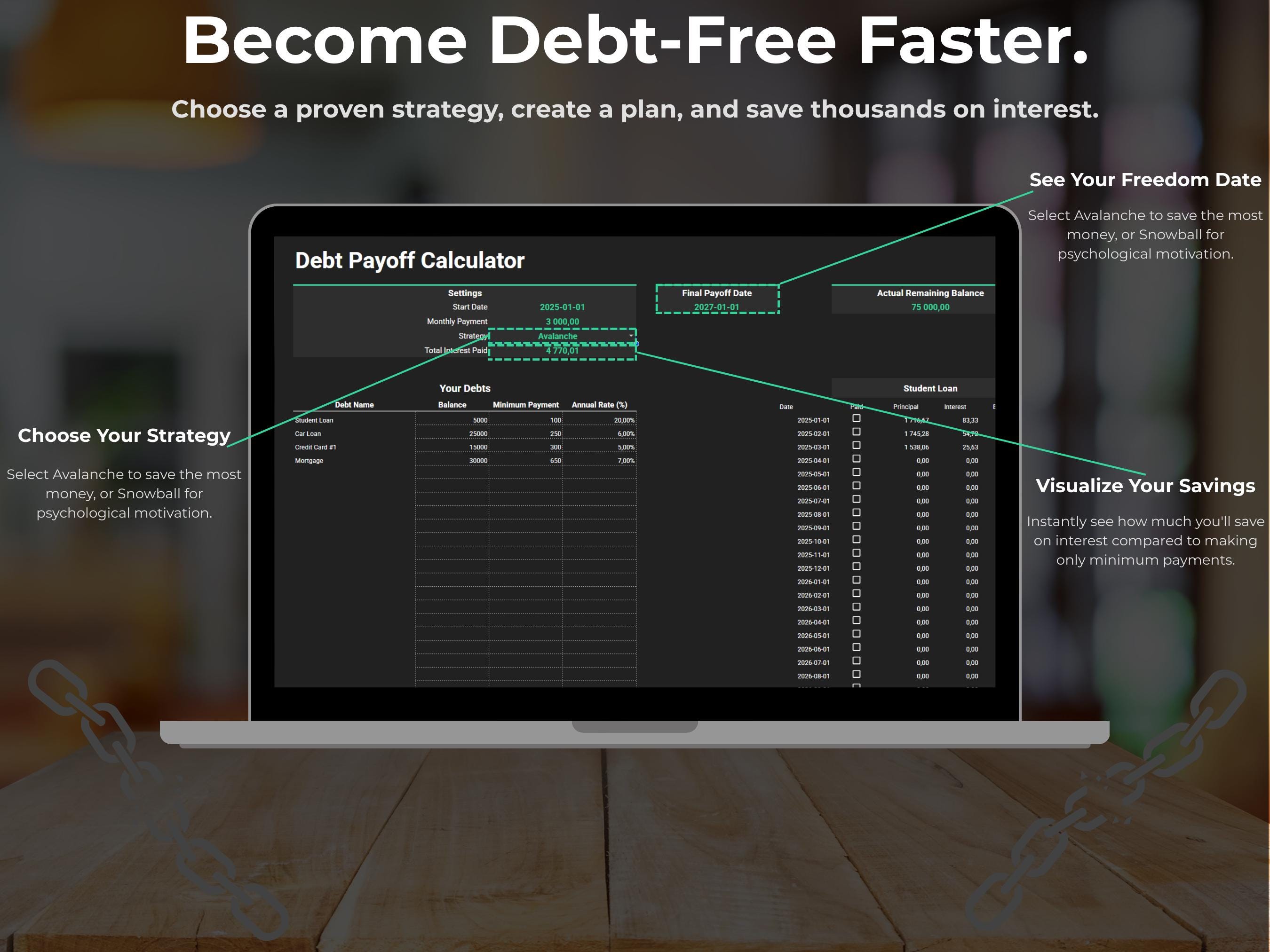 Debt Payoff Calculator: A strategic tool to become debt-free faster (Avalanche/Snowball).